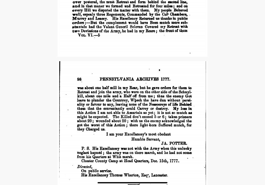The Battle of Maston’s Ford described by Brig. Gen. James Potter of the Pennsylvania Militia, in a letter to Thomas Wharton, president of the Pennsylvania Council (General Assembly), 12/15/1777; from Pennsylvania Archives