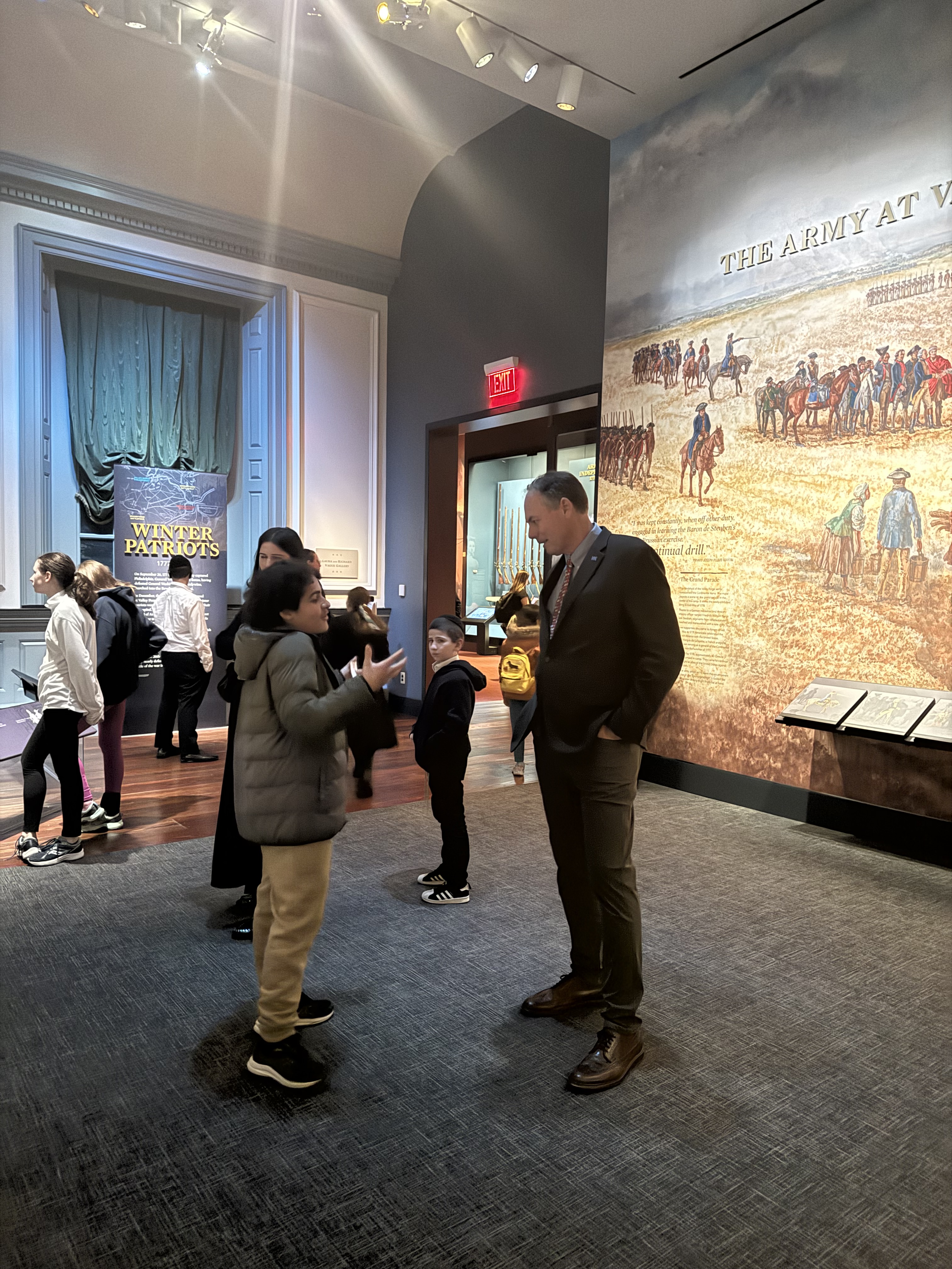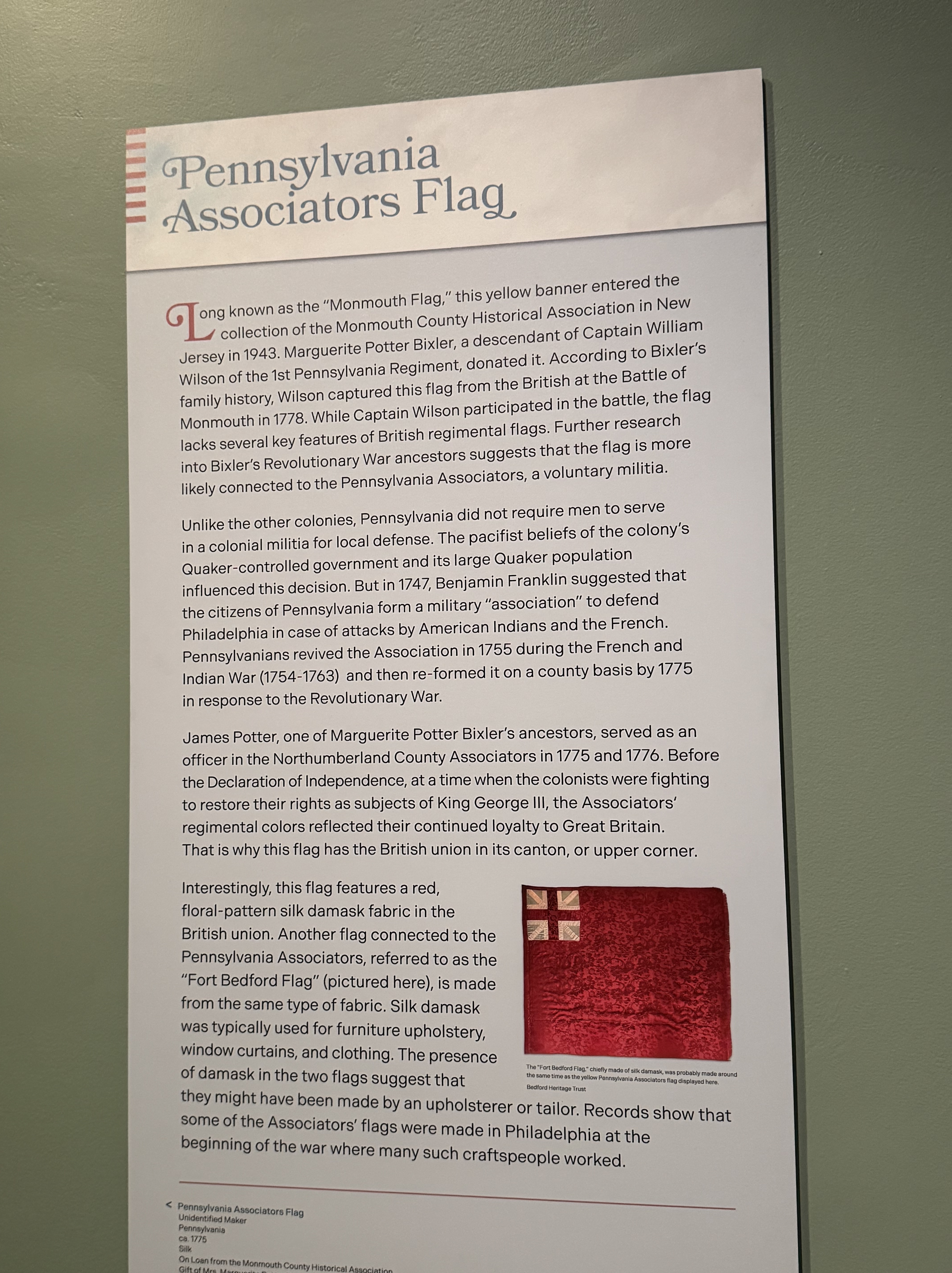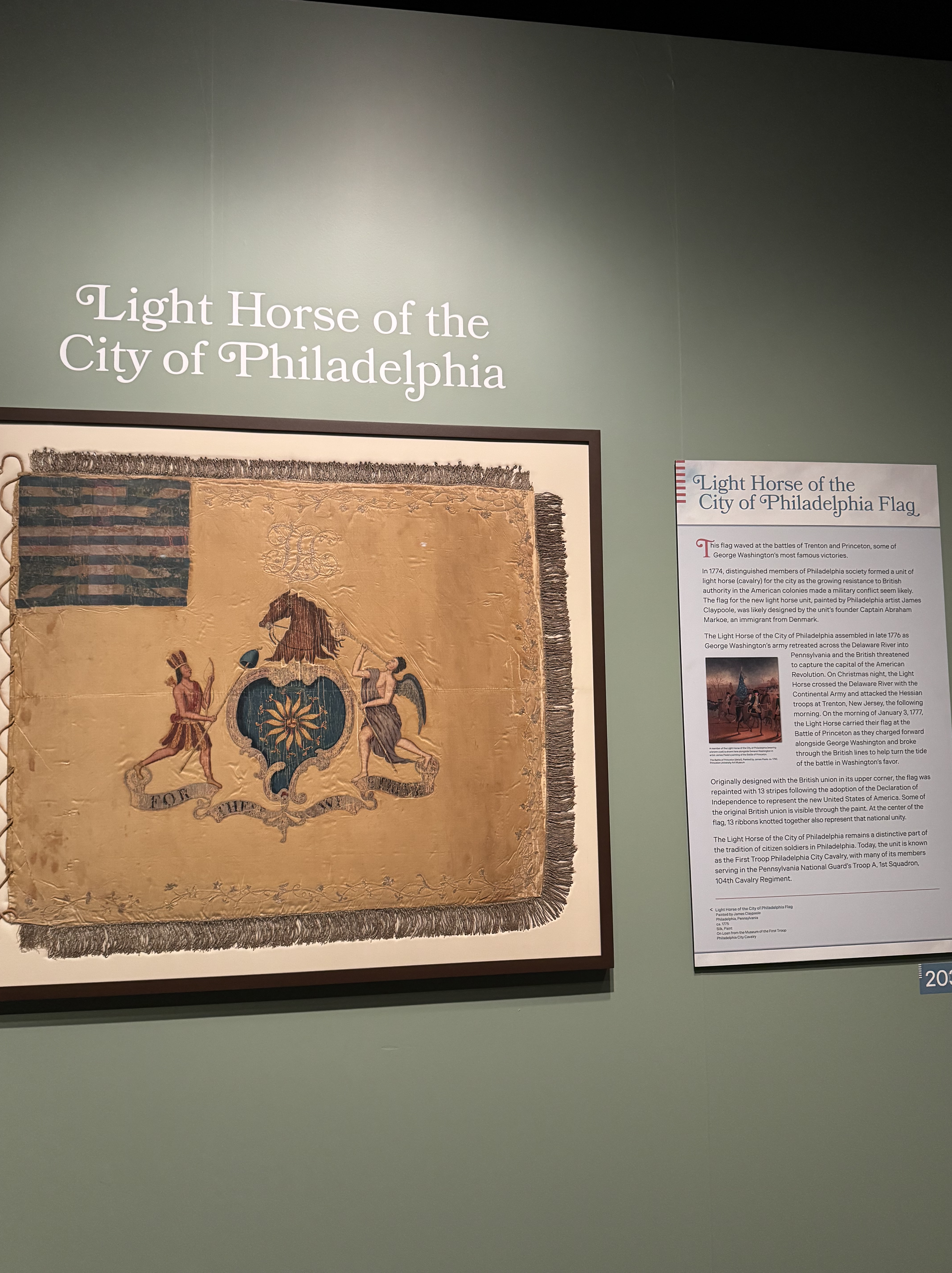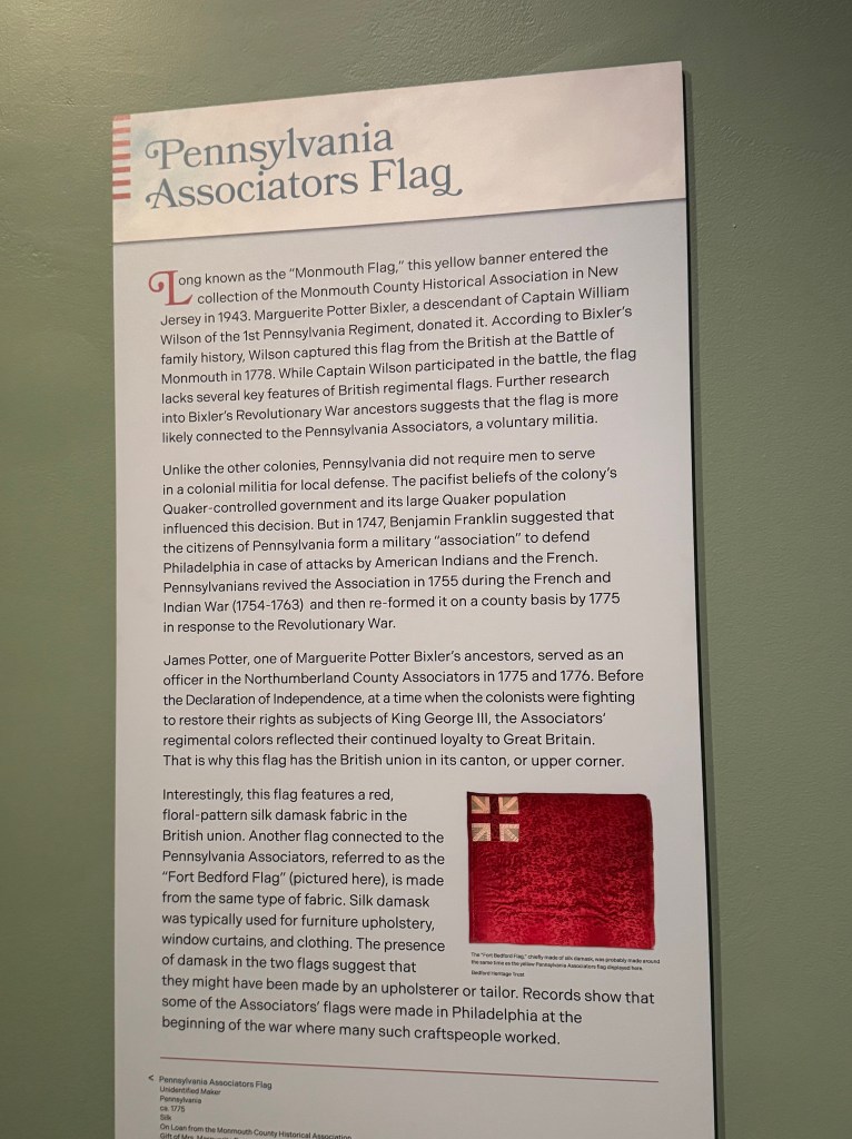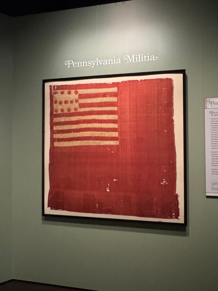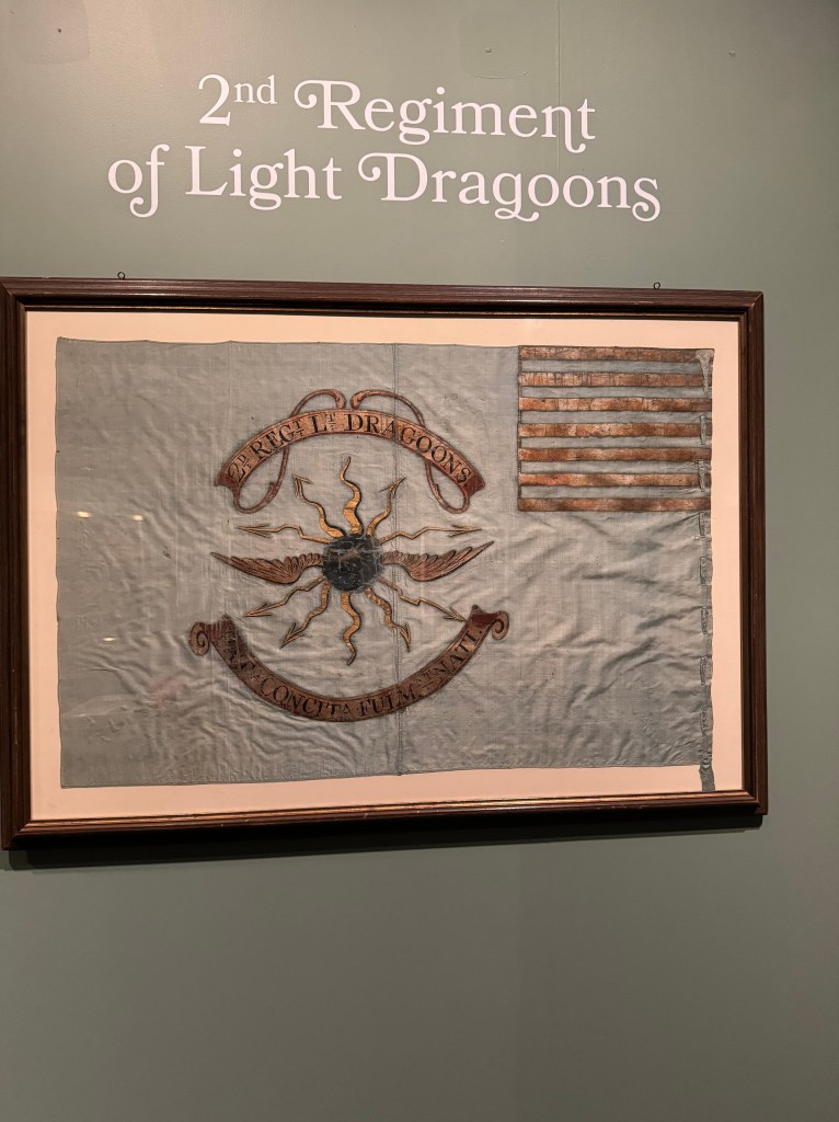 Along with a friend, Scott showed us the Museum’s new exhibit, Banners of Liberty: An Exhibition of Original Revolutionary War Flags, which opened the next day. The exhibit of fifteen Revolutionary War banner flags is the largest collection of such flags since the Revolutionary War itself. The Museum worked hard to find and collect these banners that the various Continental Army units used on the battlefields to identify themselves.