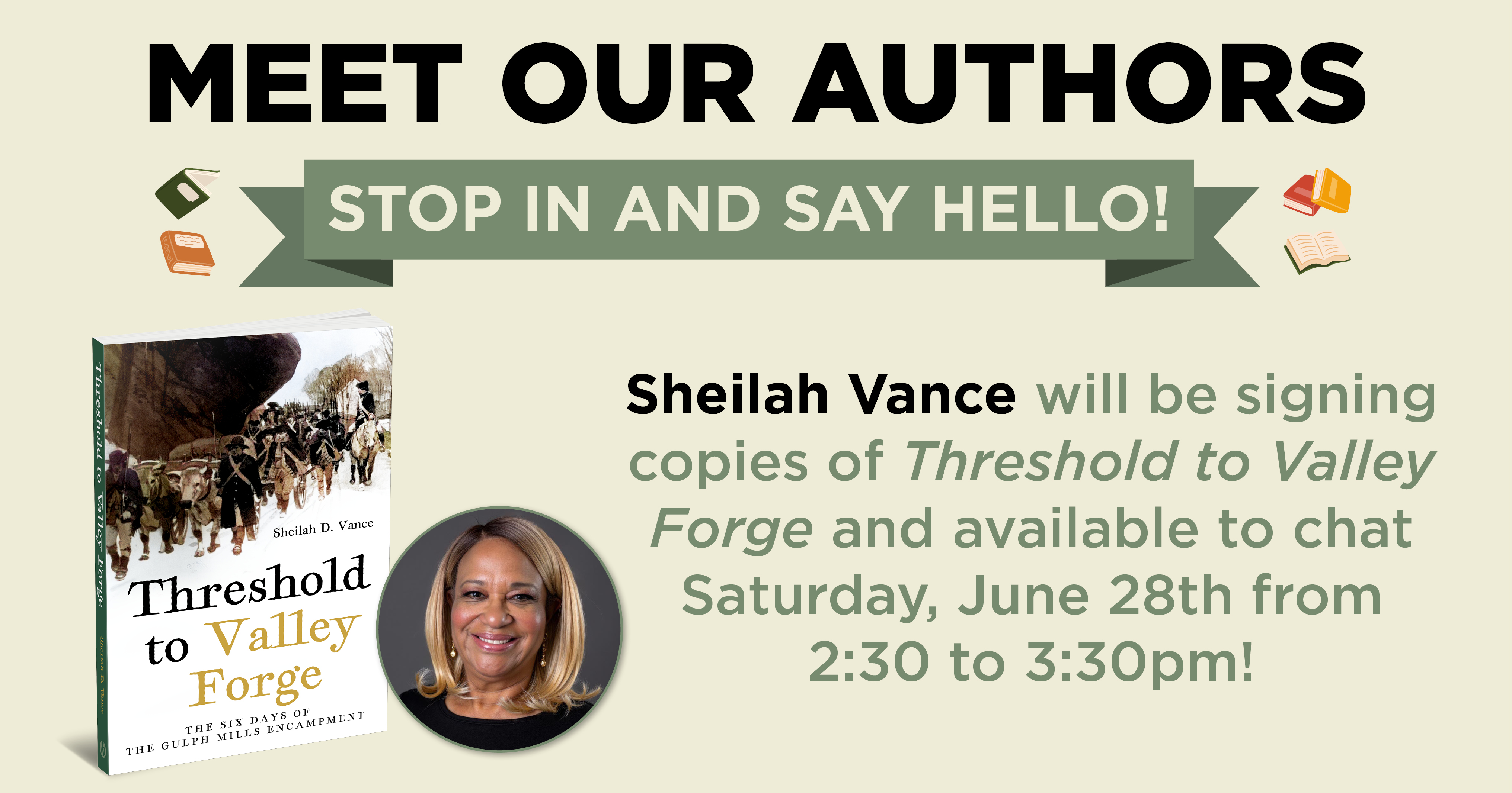 Free copies and conversation for those attending the American Library Association Conference in Philly! I’ll be at Booth 2130, Sat. 6/28, 230-330pm, Casemate Group, Exhibit Hall. For more details about my award-winning book, Threshold to Valley Forge: The Six Days of the Gulph Mills Encampment, see www,thresholdtovalleyforge.com.